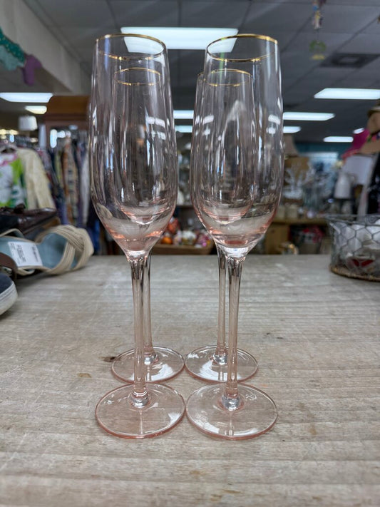 VINTAGE ROSE COLORED CHAMPAGNE FLUTES WITH GOLD TRIM SET OF 4