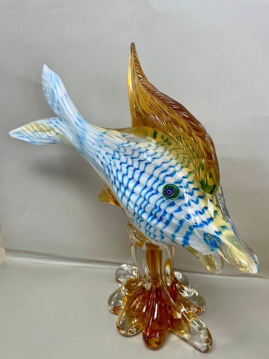 VINTAGE MURANO GLASS TROPICAL FISH BLUE / ORANGE 12"10.5"