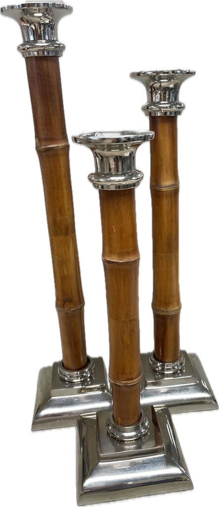 BAMBOO AND NICKLE CANDLE HOLDER SET OF 3 16"14"12"