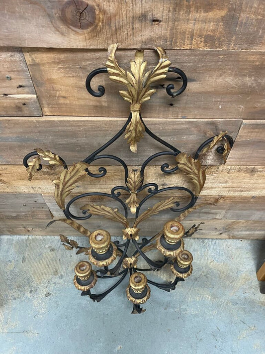 MCM ITALIAN BLACK AND GOLD METAL AND TOLE WALL CANDLE SCONE 34X19