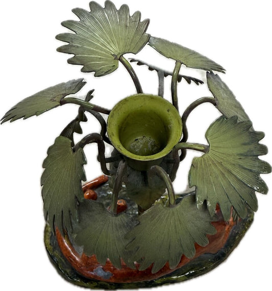 VINTAGE CAST METAL LEOPARD AND PALM TREE CANDLE HOLDER