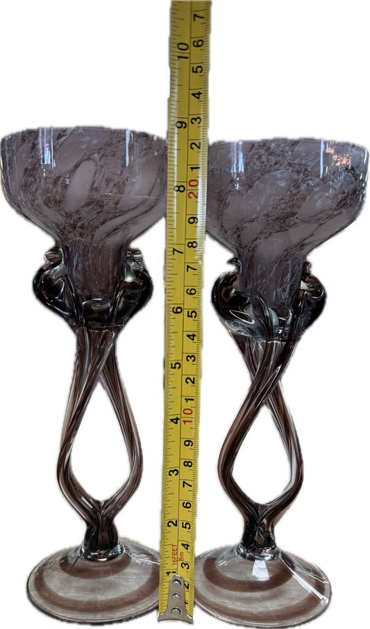 MAKORA KROSNO PURPLE GLASS GOBLET PILLAR OR TAPER CANDLE STICK HOLDERSET OF 2
