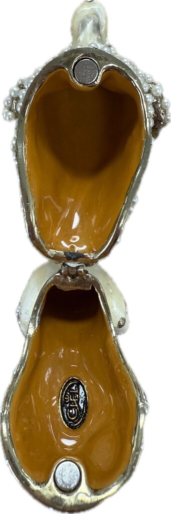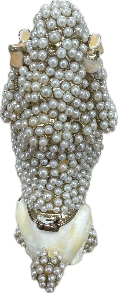 Charming vintage poodle trinket box covered in faux pearls with gold-tone accents. This hinged collectible opens to reveal a small compartment, perfect for holding rings, earrings, or tiny treasures. A whimsical yet elegant piece that blends vintage charm with a touch of glam, ideal for display or gifting.