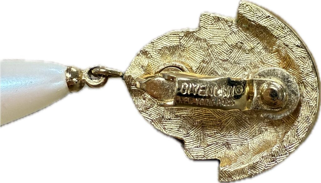 GIVENCHY ENAMEL RHINESTONE AND PEARL TEARDROP DANGLE RUNWAY COUTURE CLIP ON EARRINGS