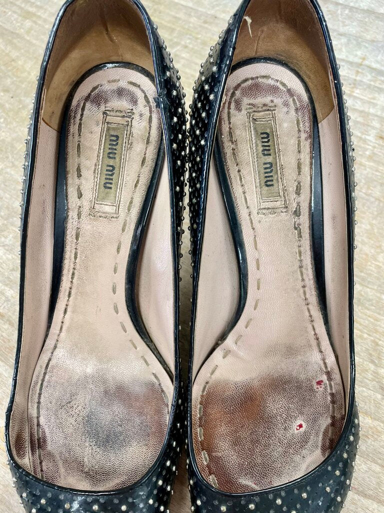 MIU MIU BLACK PATENT LEAHER SILVER KITTEN HEEL