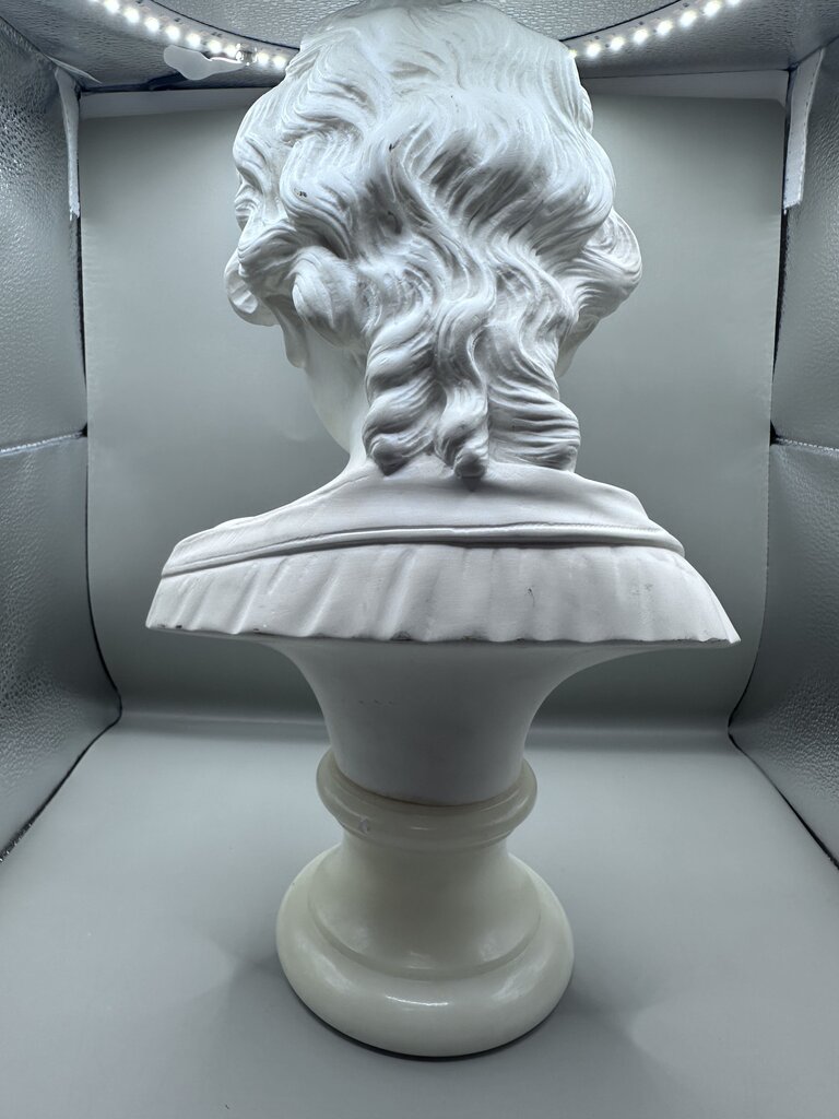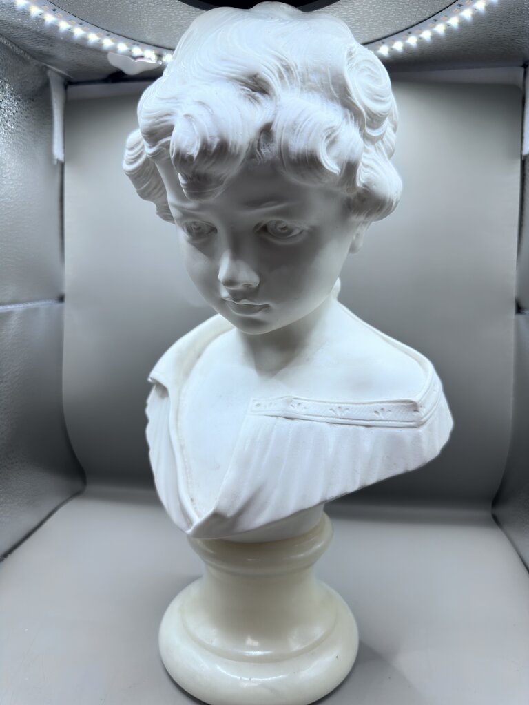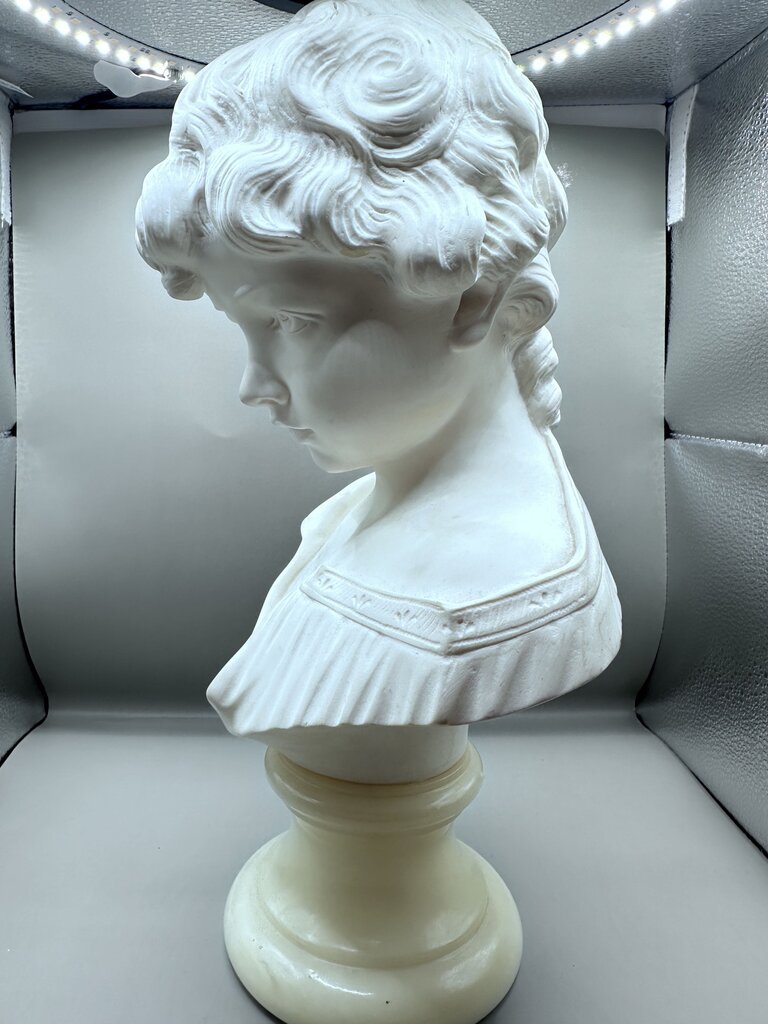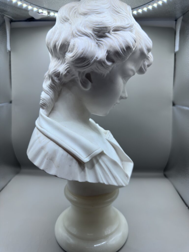 Bust of AGirl composition sculpture, set on alabaster base, restoration to base. 13 1/2''