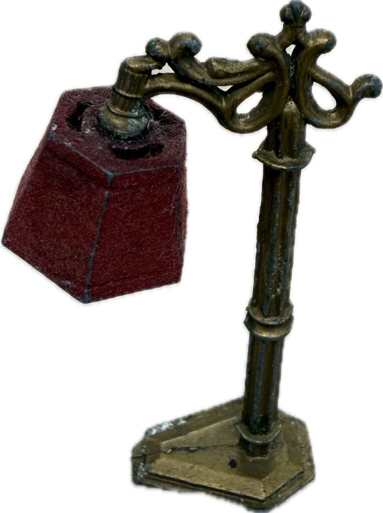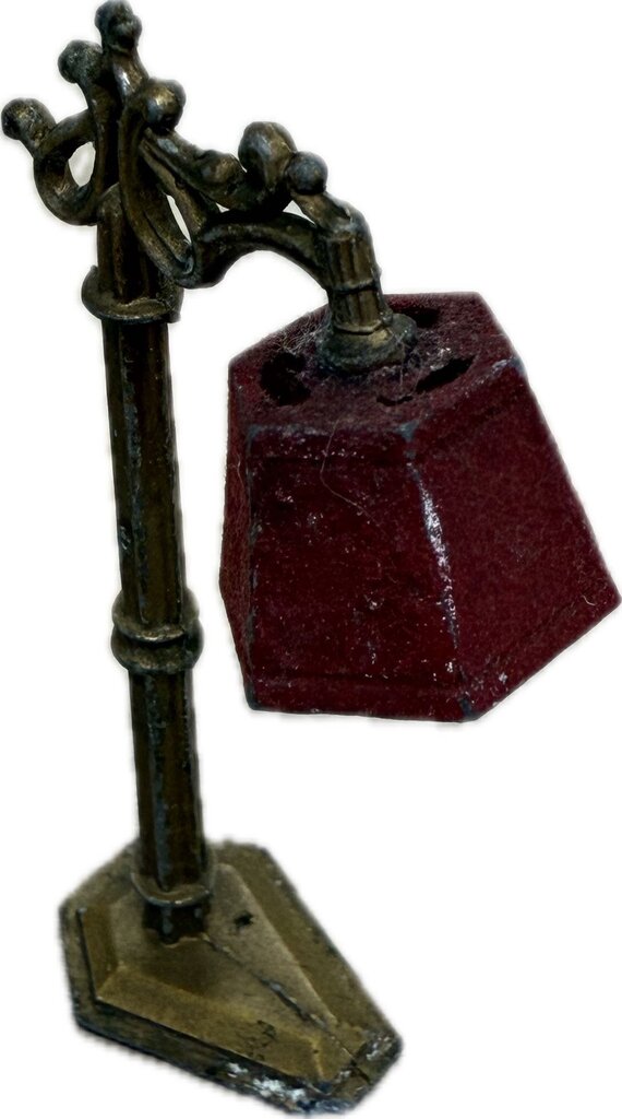 Charming vintage dollhouse furniture lot featuring a set of metal miniature pieces, including two wooden-style chairs, one green chair, one blue chair, a green bench, and a standing floor lamp with a red shade. These pieces have a lovely aged patina and classic styling, perfect for collectors or as display accents in vintage or dollhouse scenes.
